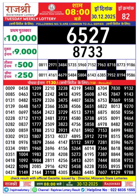 Rajshree Night Lottery 9pm Result 30.12.2025