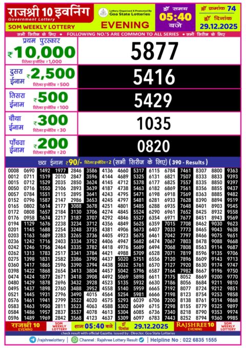 Rajshree 10 Daily Lottery 5.40PM Result 29.12.2025