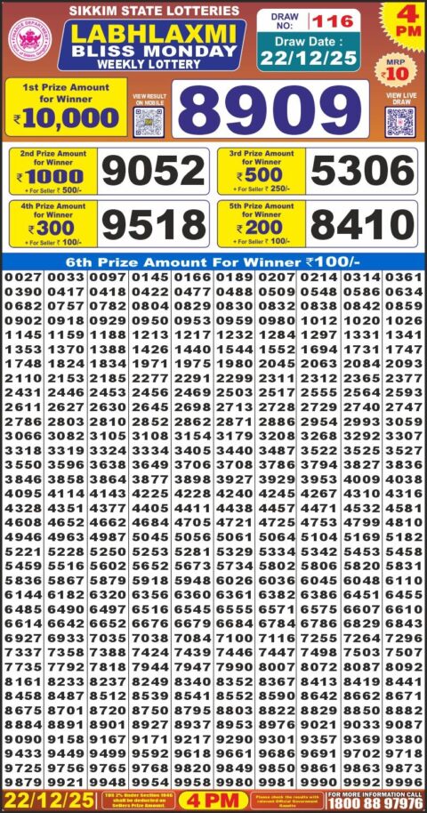 Sikkim State Dear Lottery 6PM Result 22.12.2025
