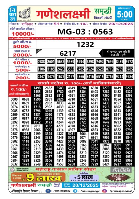 Maharashtra Ganeshlaxmi Weekly Lottery 5PM Result 20.12.2025