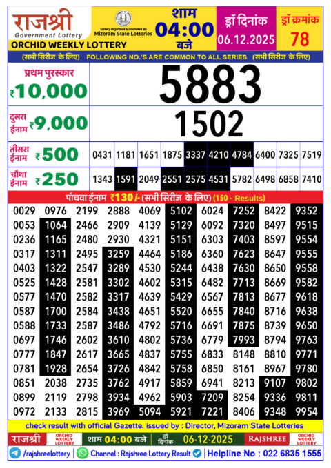 Rajshree Daily Lottery 1PM Result 06.12.2025