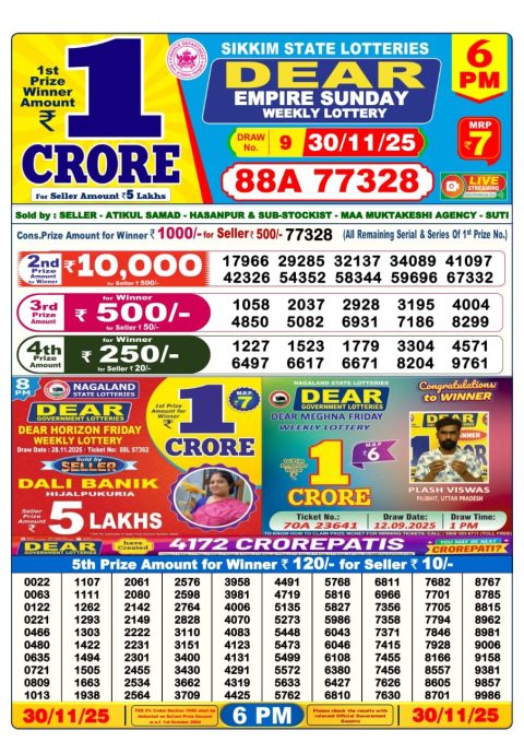 Sikkim State Dear Lottery 6PM Result 30.11.2025