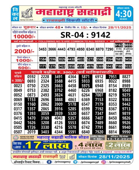 Maharashtra Sahyadri Weekly Lottery 4.30PM Result 28.11.2025