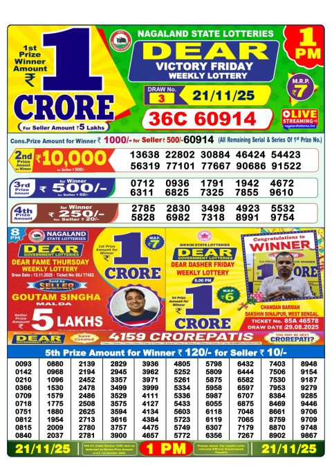 Nagaland State Dear Lottery 1PM Result 21.11.2025