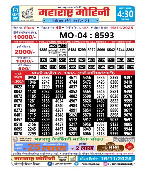 Maharashtra Mohini Weekly Lottery Result, 4.15pm, 16.11.2025