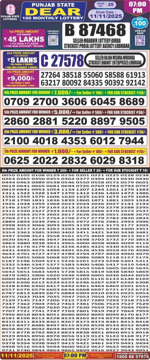 Punjab State Dear 50 Daily Lottery 6PM Result 12.11.2025