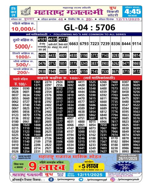 Maharashtra Gajlaxmi Weekly Lottery 4.45PM Result 12.11.2025