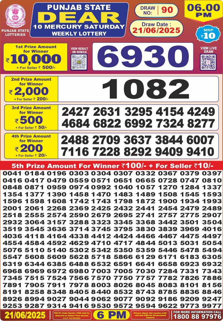 Punjab State Dear 10 Daily 6 Pm Result 21.06.2025 June 21, 2025 Leave a comment Related Results Labh Laxmi Daily Lottery 4 Pm Result 7.06.2025 Rajshree Daily Lottery 4PM Result 25.08.2025 Maharashtra Gaurav Monthly Lottery Result 21.05.2025