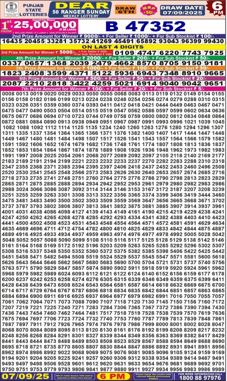 Punjab State Dear 50 Daily Lottery 6PM Result 07.09.2025 September 7, 2025 Leave a comment Related Results Dear Daily Weekly Lottery 6 PM Result 01.05.2025 Dear 10 Daily Lottery 1:30PM Result 24.07.2025 Rajshree Daily Lottery 1PM Result 11.08.2025