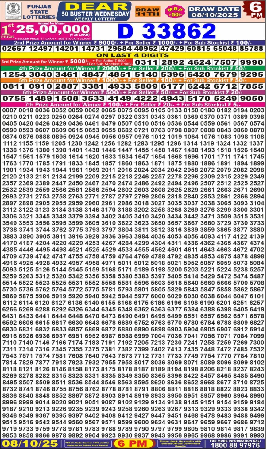 Punjab State Dear 50 Daily Lottery 6PM Result 08.10.2025