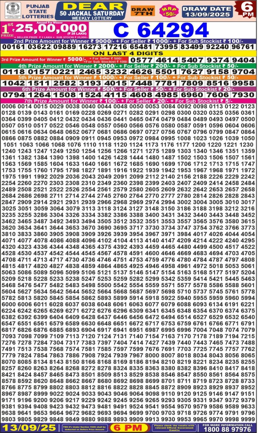 Punjab State Dear 50 Daily Lottery 6PM Result 13.09.2025