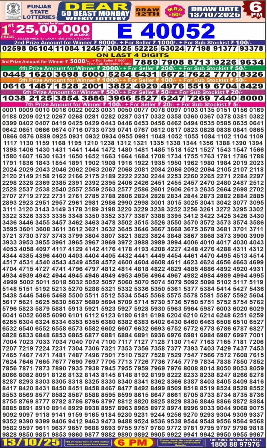 Punjab State Dear 50 Daily Lottery 6PM Result 13.10.2025 October 13, 2025 Leave a comment Related Results Rajshree Daily Lottery 1:00 PM Result 08.05.2025 Maharashtra Gajlaxmi Weekly Lottery 4.30 PM Result 03.07.2025 Sikkim State Dear Lottery 6PM Result 05.09.2025
