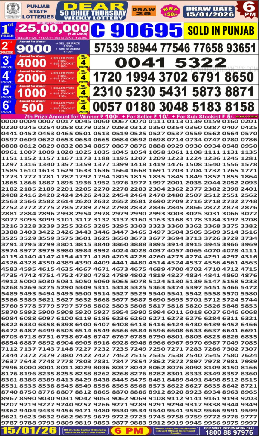 Punjab State Dear 50 Daily Lottery 6PM Result 15.01.2026