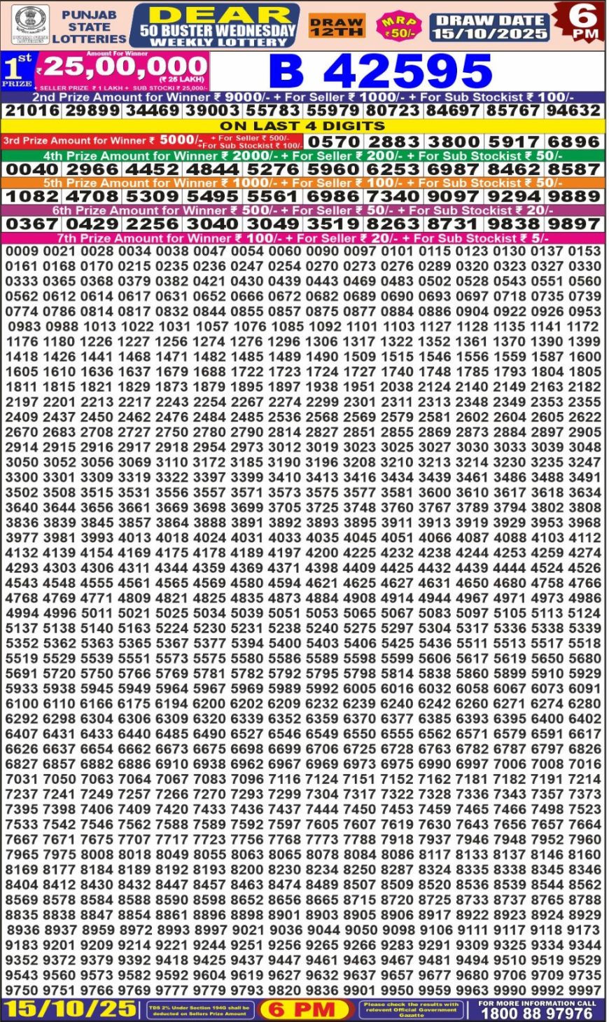 Punjab State Dear 50 Daily Lottery 6PM Result 15.10.2025 October 15, 2025 Leave a comment Related Results Punjab State Dear 10 Daily 6 PM Result 26.4.2025 Rajshree Daily Lottery 8 PM Result 08.05.2025 Maharashtra Gajlaxmi Weekly Lottery 4.45PM Result 27.07.2025