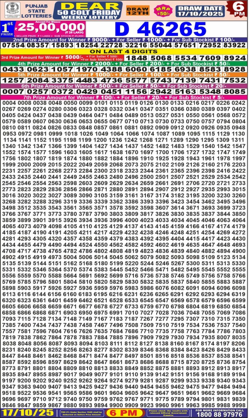 Punjab State Dear 50 Daily Lottery 6PM Result 17.10.2025 October 17, 2025 Leave a comment Related Results Rajshree 50 Daily Lottery 7.30 Pm Result 12.06.2025 Maharashtra Gajlaxmi Weekly Lottery 4.45 PM Result 07.07.2025 Punjab State Dear 10 Daily Lottery 6PM Result 24.07.2025