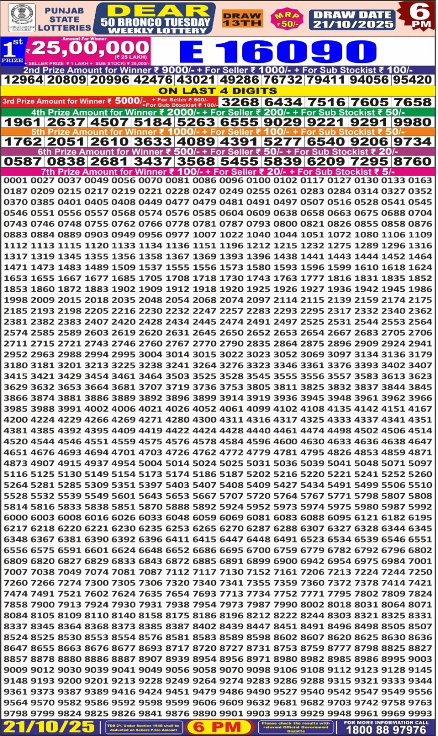 Punjab State Dear 50 Daily Lottery 6PM Result 21.10.2025 October 21, 2025 Leave a comment Related Results Punjab State Dear 10 Daily Lottery 6PM Result 19.07.2025 Dear 10 Lottery 1:30 Pm Result 31.05.2025 Dear Super Daily Lottery 7 PM Result 12.07.2025