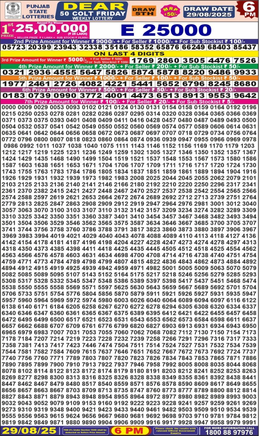 Punjab State Dear 50 Daily Lottery 6PM Result 29.08.2025 August 29, 2025 Leave a comment Related Results Dear 10 Daily Lottery 1.30 PM Result 02.07.2025 Maharashtra Gajlaxmi Weekly Lottery 4.45PM Result 28.08.2025 Rajshree Daily Lottery 1PM Result 02.08.2025