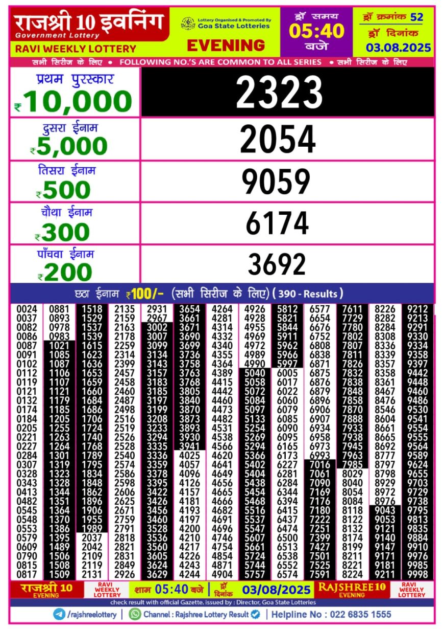 Rajshree 10 Daily Lottery 5.40PM Result 03.08.2025 August 3, 2025 Leave a comment Related Results Rajshree Daily Lottery 8PM Result 29.09.2025 Maharashtra Sahyadri Weekly Lottery 4.30 Pm Result 31.05.2025 Rajshree 50 Daily Lottery 7.30 Pm Result 16.06.2025