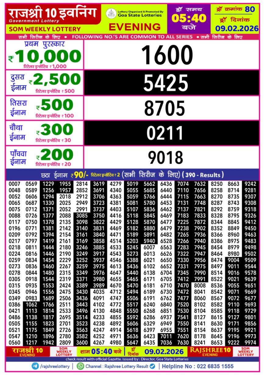 Rajshree 10 Daily Lottery 5.40PM Result 09.02.2026