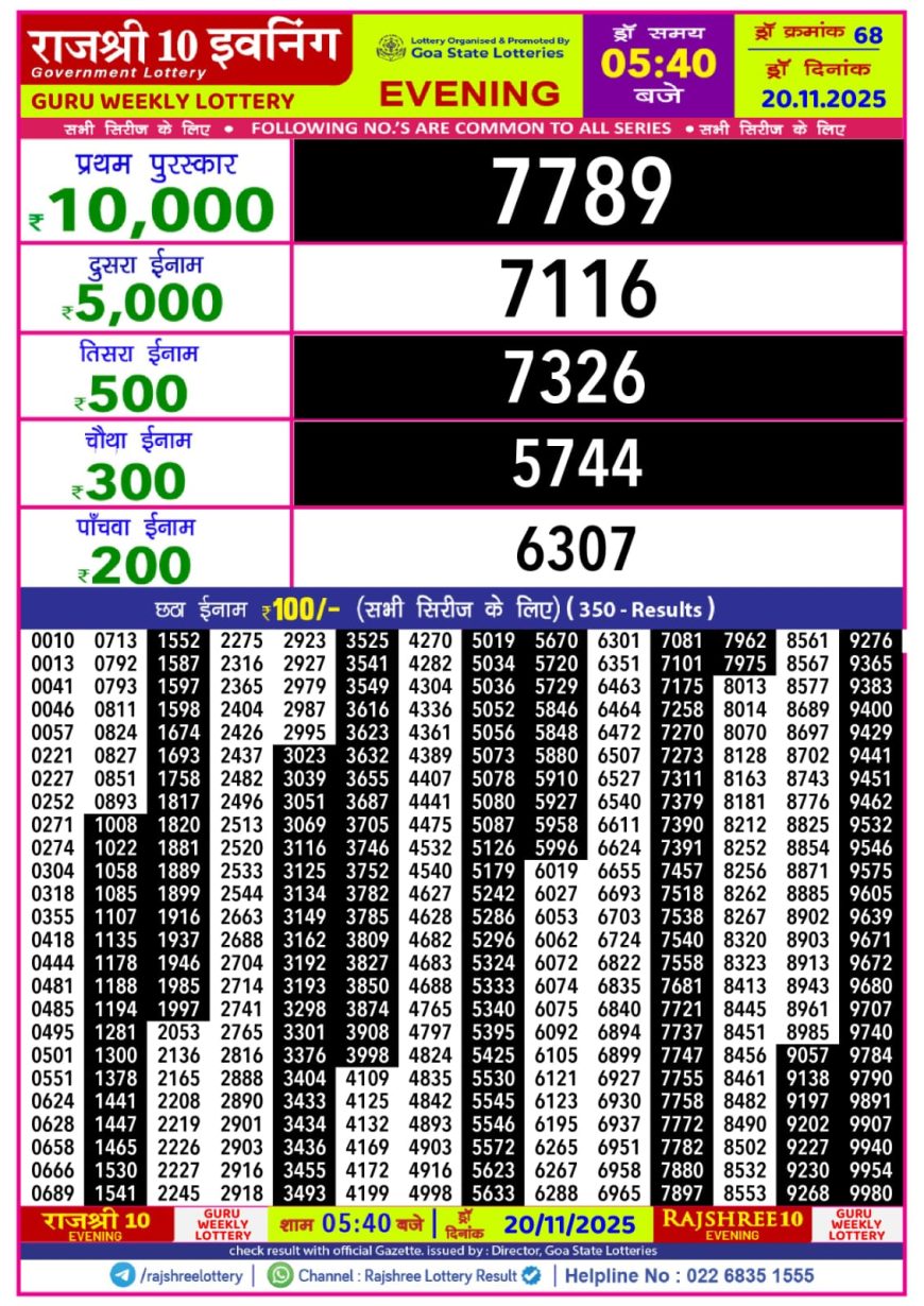 Rajshree 10 Daily Lottery 5.40PM Result 20.11.2025