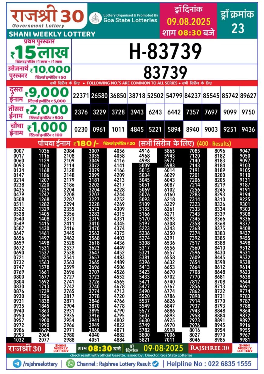 Rajshree 30 Weekly Lottery 8:30PM Result 09.08.2025 August 9, 2025 Leave a comment Related Results Maharashtra Weekly Lottery 4.15 PM Result 12.07.2025 Maharashtra Lottery Result Today 4Pm 11.06.2025 Punjab State Dear 10 Daily 6 Pm Result 2.06.2025