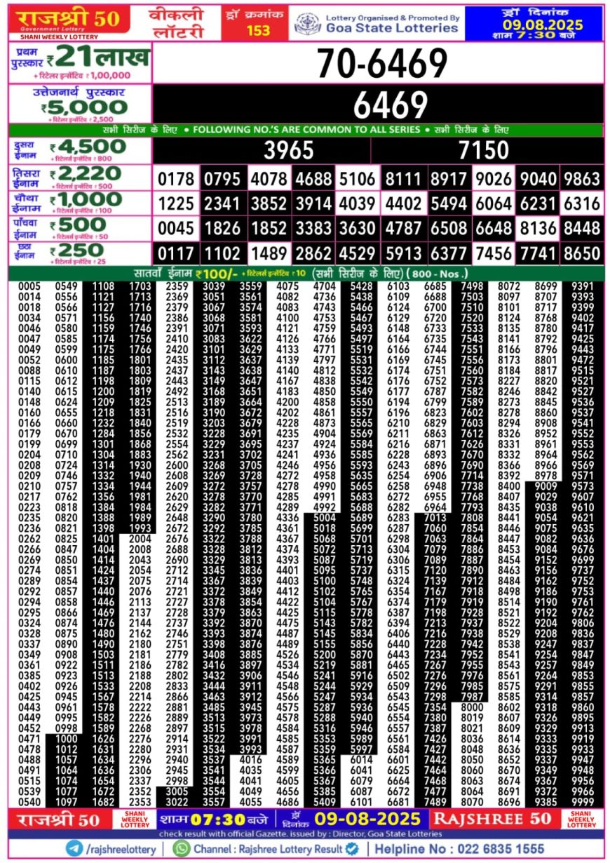 Rajshree 50 Weekly Lottery 7:30PM Result 09.08.2025 August 9, 2025 Leave a comment Related Results Punjab State Dear 10 Daily 6 Pm Result 15.05.2025 Golden Star Lottery 9PM Result 26.09.2025 Labh Laxmi Daily Lottery 4 Pm Result 22.06.2025