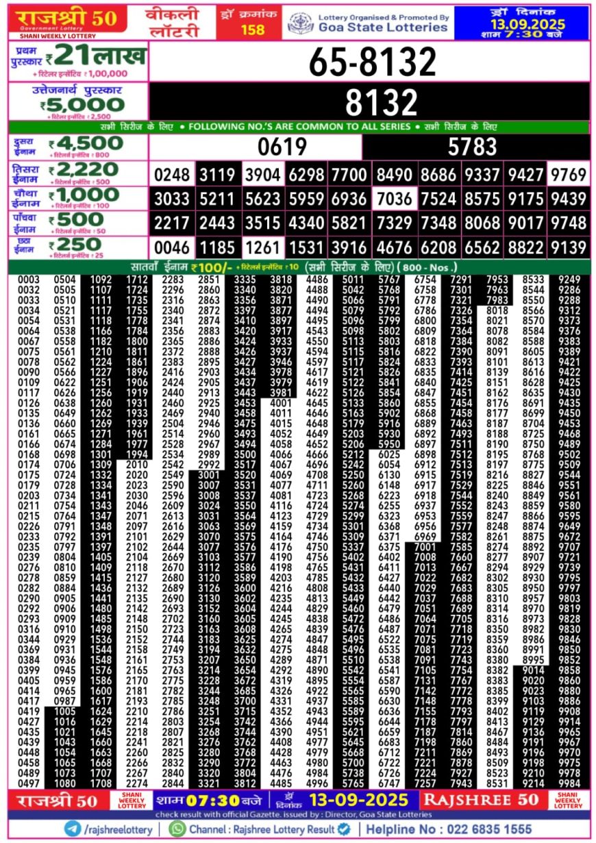 Rajshree 50 Weekly Lottery 7:30PM Result 13.09.2025 September 13, 2025 Leave a comment 13 September 2025 7.30pm – Goa state Rajshree 50 lotteries 7.30pm Result has been declared for 13/09/2025 . First prize rupees 21 lakh Winning Ticket 65_8132 went unsold Today . Rest of the result is published here for your reference. Related Results Dear 10 Daily Lottery 1:30PM Result 25.08.2025 Rajshree 30 Daily Lottery 8.30 PM Result 10.05.2025 Maharashtra Sahyadri Weekly Lottery 4.30 Pm Result 23.05.2025