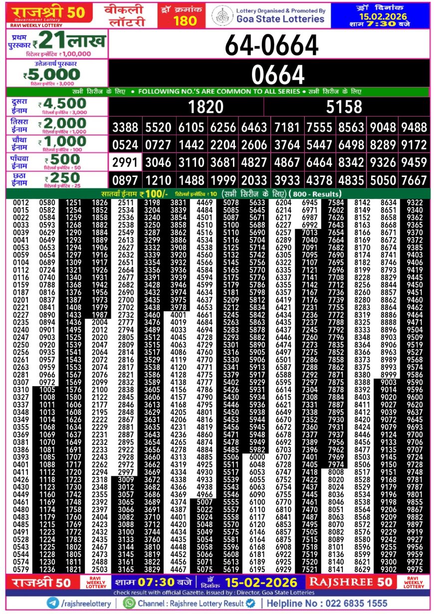 Rajshree 50 Weekly Lottery 7:30PM Result 15.02.2026