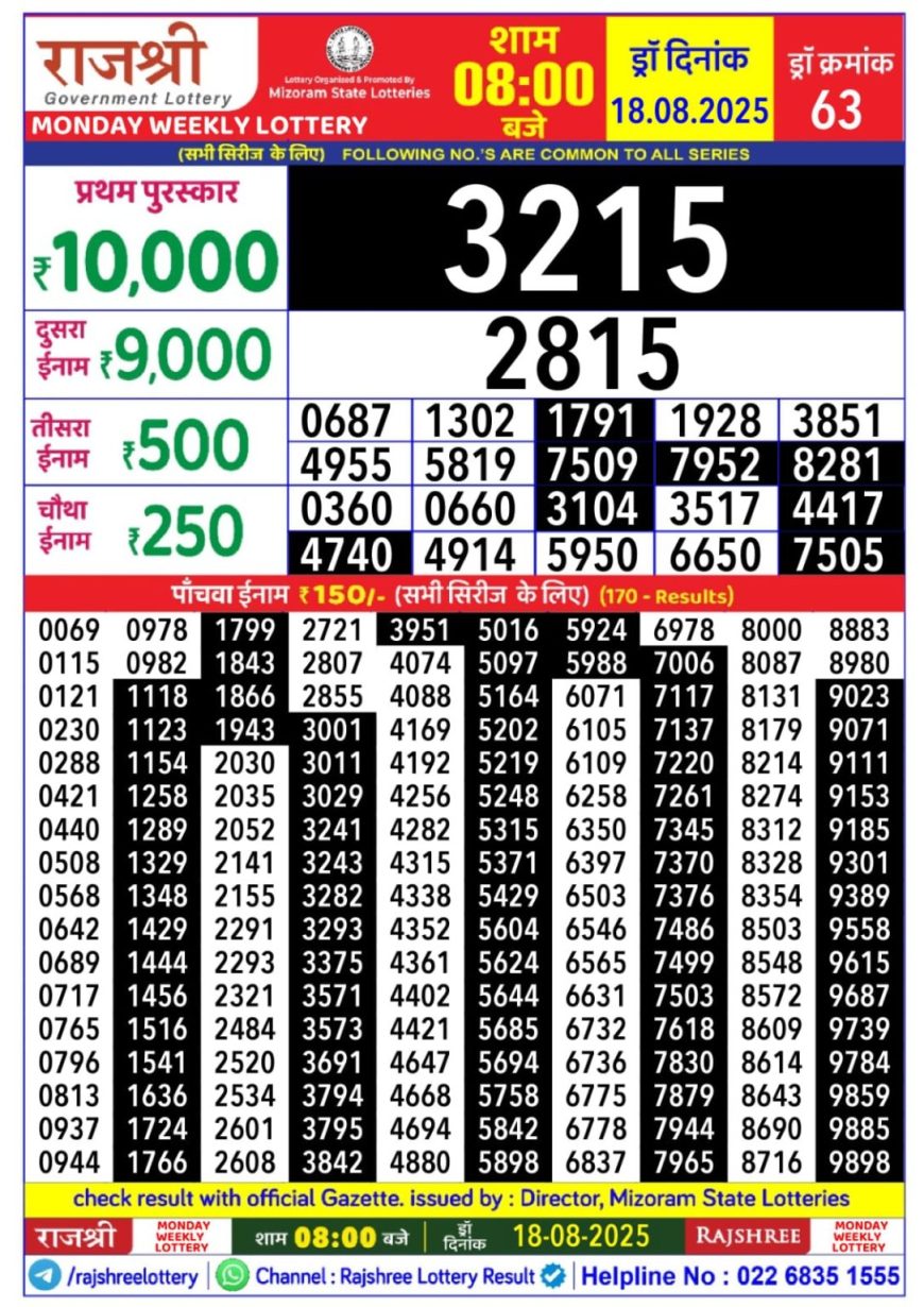 Rajshree 50 Weekly Lottery 7:30PM Result 18.08.2025 August 18, 2025 Leave a comment Ko Related Results Rajshree Daily Lottery 4PM Result 30.08.2025 Rajshree Daily Lottery 1PM Result 03.08.2025 Punjab State Dear 50 Daily Lottery 6PM Result 14.10.2025