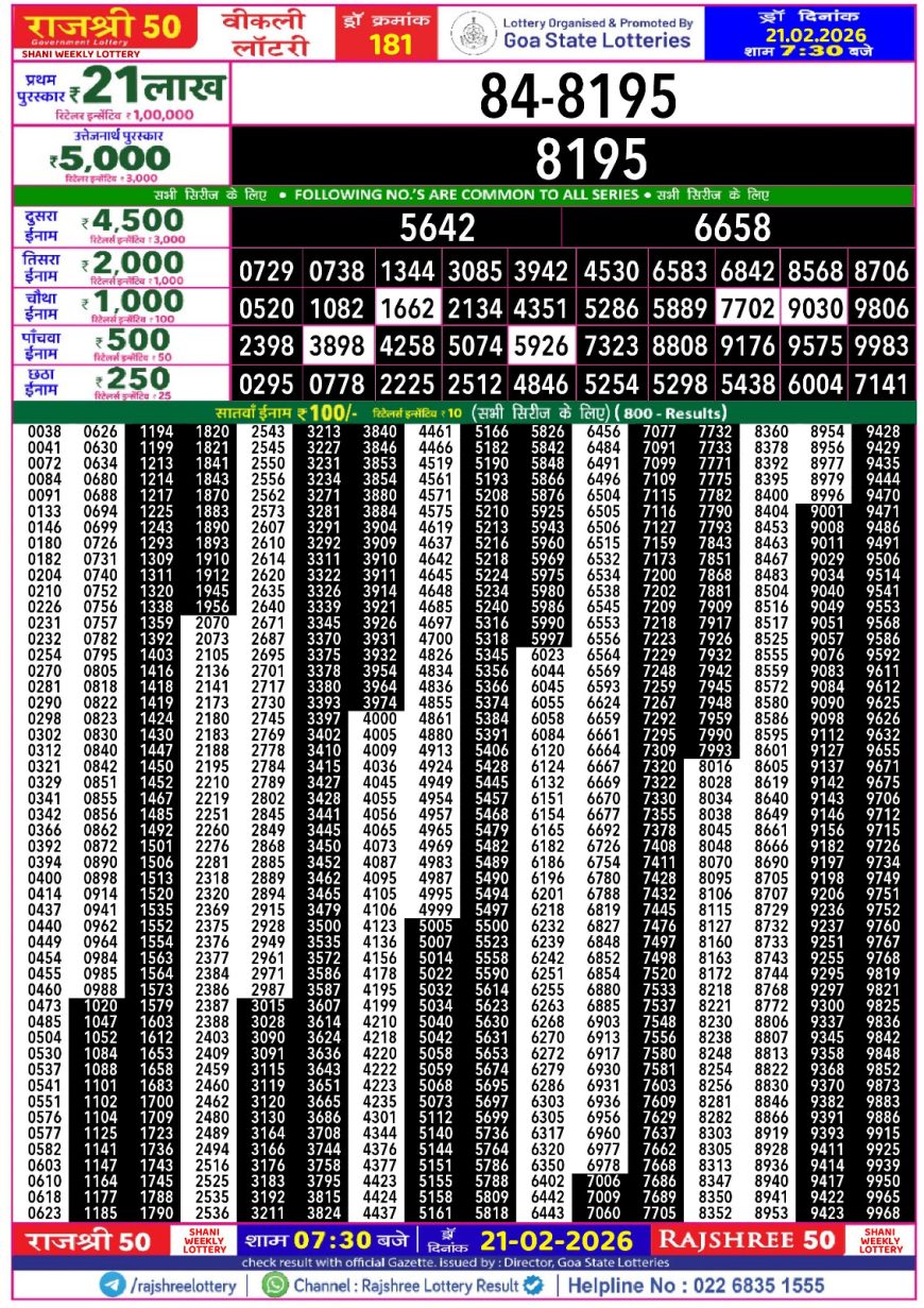 Rajshree 50 Weekly Lottery 7:30PM Result 21.02.2026 February 21, 2026 Leave a comment Related Results Maharashtra Ganeshlaxmi Weekly Lottery 5PM Result 19.08.2025 Sikkim State Dear Lottery 6PM Result 06.12.2025 Maharashtra Gajlaxmi Weekly Lottery 4.45PM Result 19.10.2025