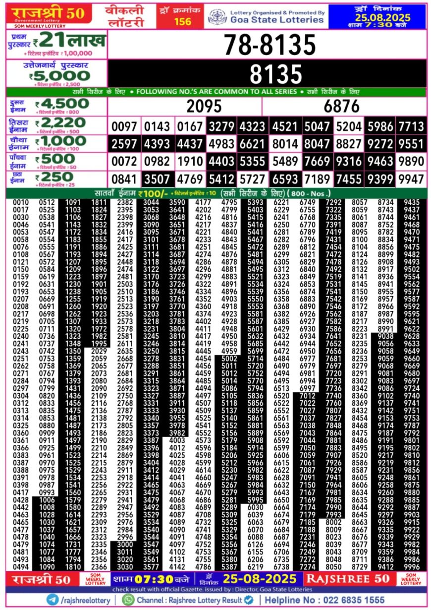 Rajshree 50 Weekly Lottery 7:30PM Result 25.08.2025 August 25, 2025 Leave a comment 25 August 2025 7.30pm – rajshree50 goa state Lotteries 7.30pm Result has been declared for 25/08/2025 . The First prize 21 lakhs Ticke 78 8135went Unsold.second prize is rs 5000 ticket8135 …Rest of the result is published here for your reference. Related Results Labh Laxmi Daily Lottery 4PM Result 23.07.2025 Maharashtra Weekly Lottery 4.15PM Result 23.08.2025 Punjab State Dear 10 Daily 6 PM Result 03.05.2025
