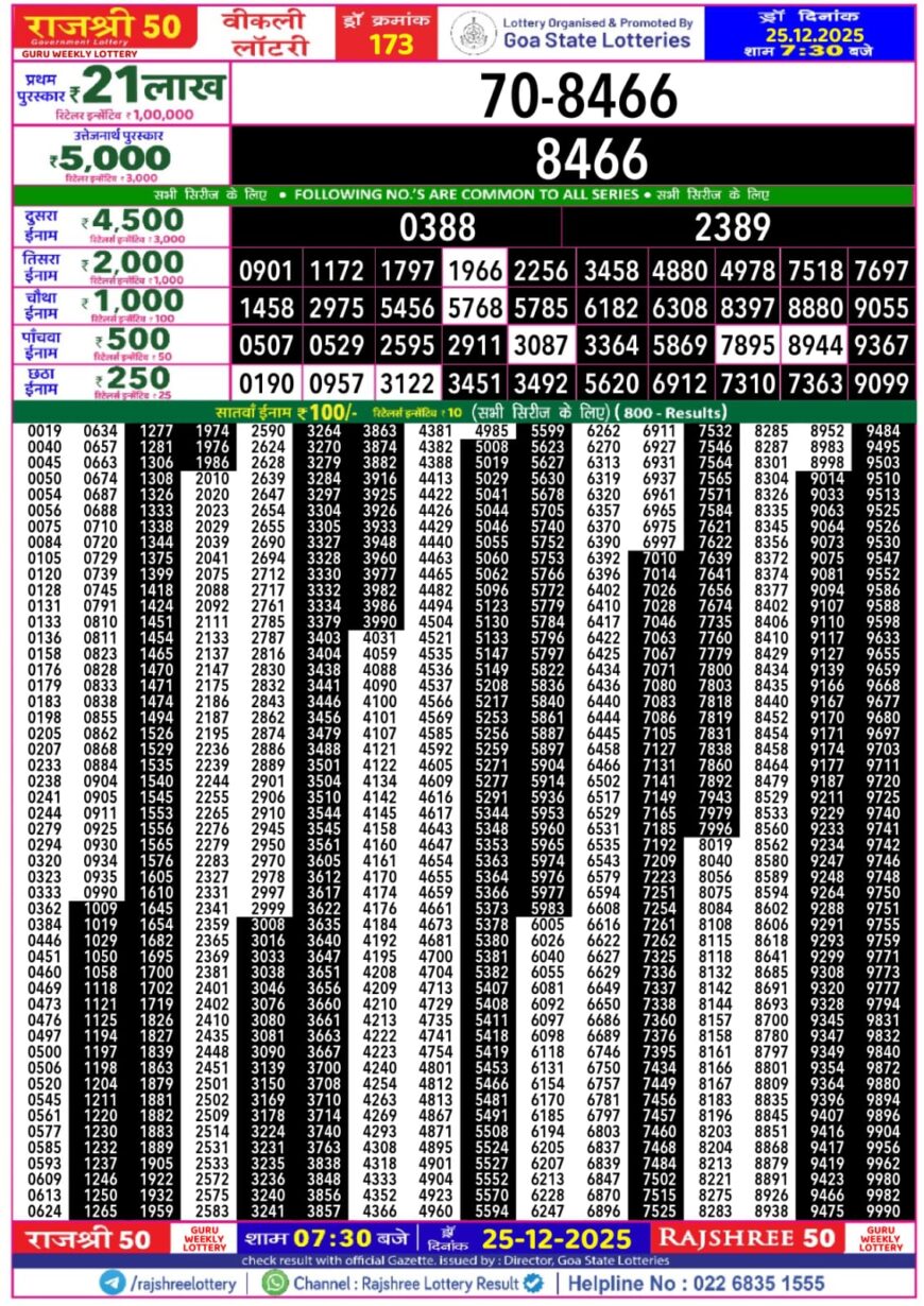 Rajshree 50 Weekly Lottery 7:30PM Result 25.12.2025
