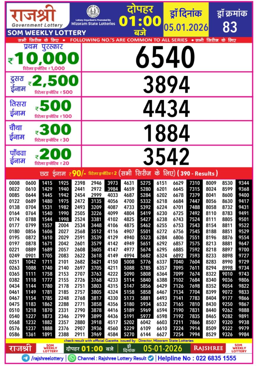 Rajshree Daily Lottery 1PM Result 05.01.2026