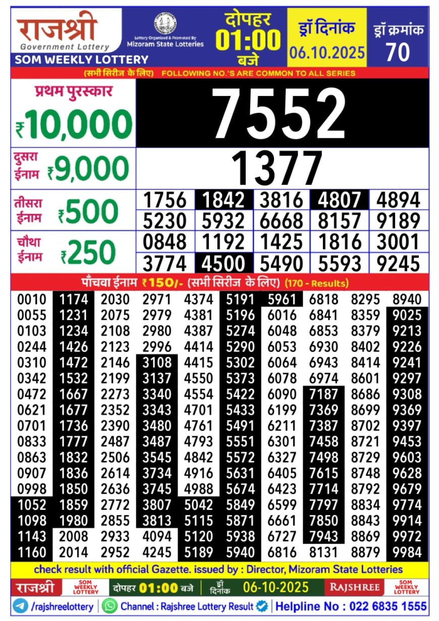 06 October 2025 1pm – Mizoram state Rajshree Lotteries 1pm Result has been declared for 06/10/2025 . First prize rupees 10,000 Winning Ticket 7552 .Rest of the result is published here for your reference.,