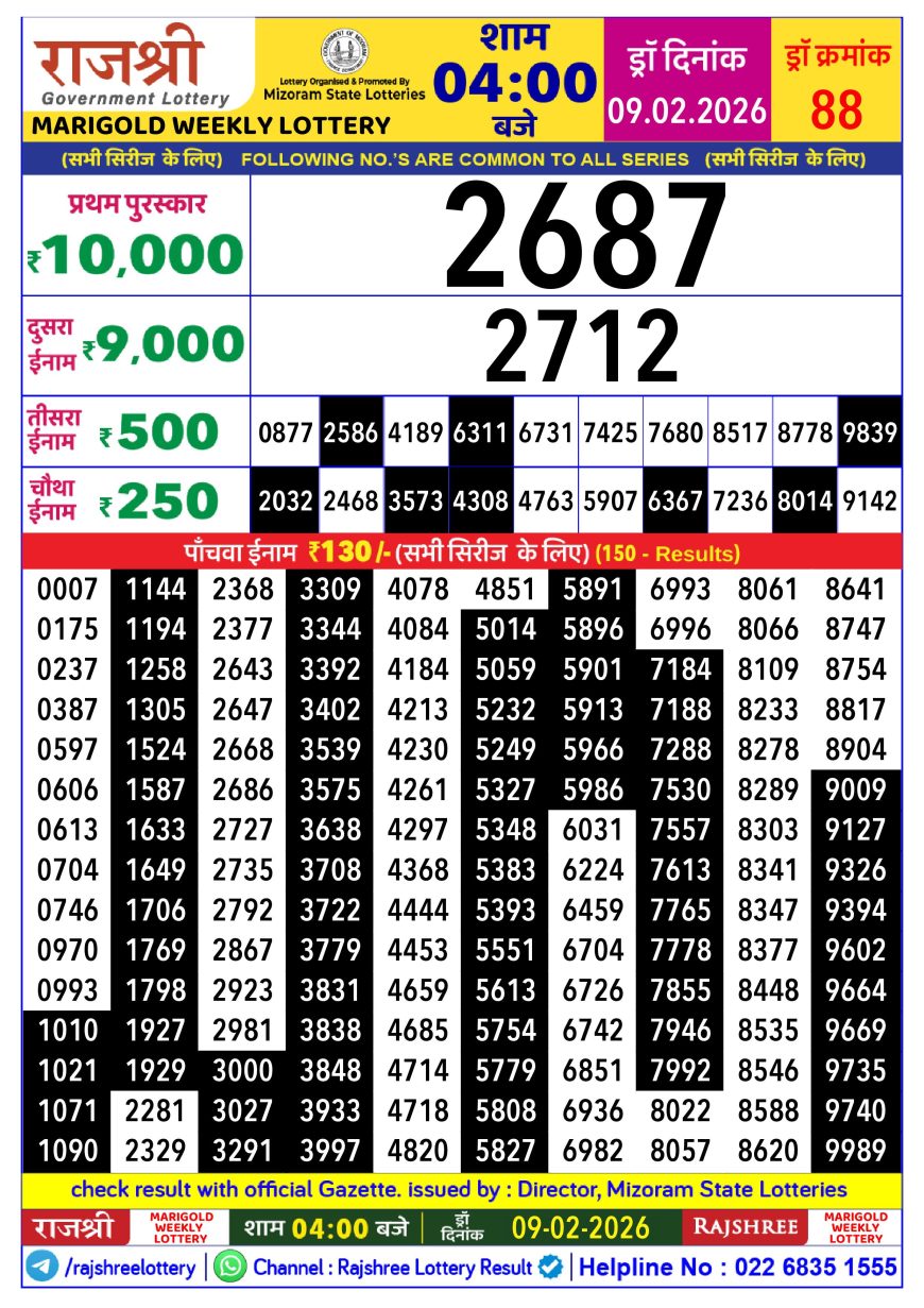 Rajshree Daily Lottery 4PM Result 09.02.2026