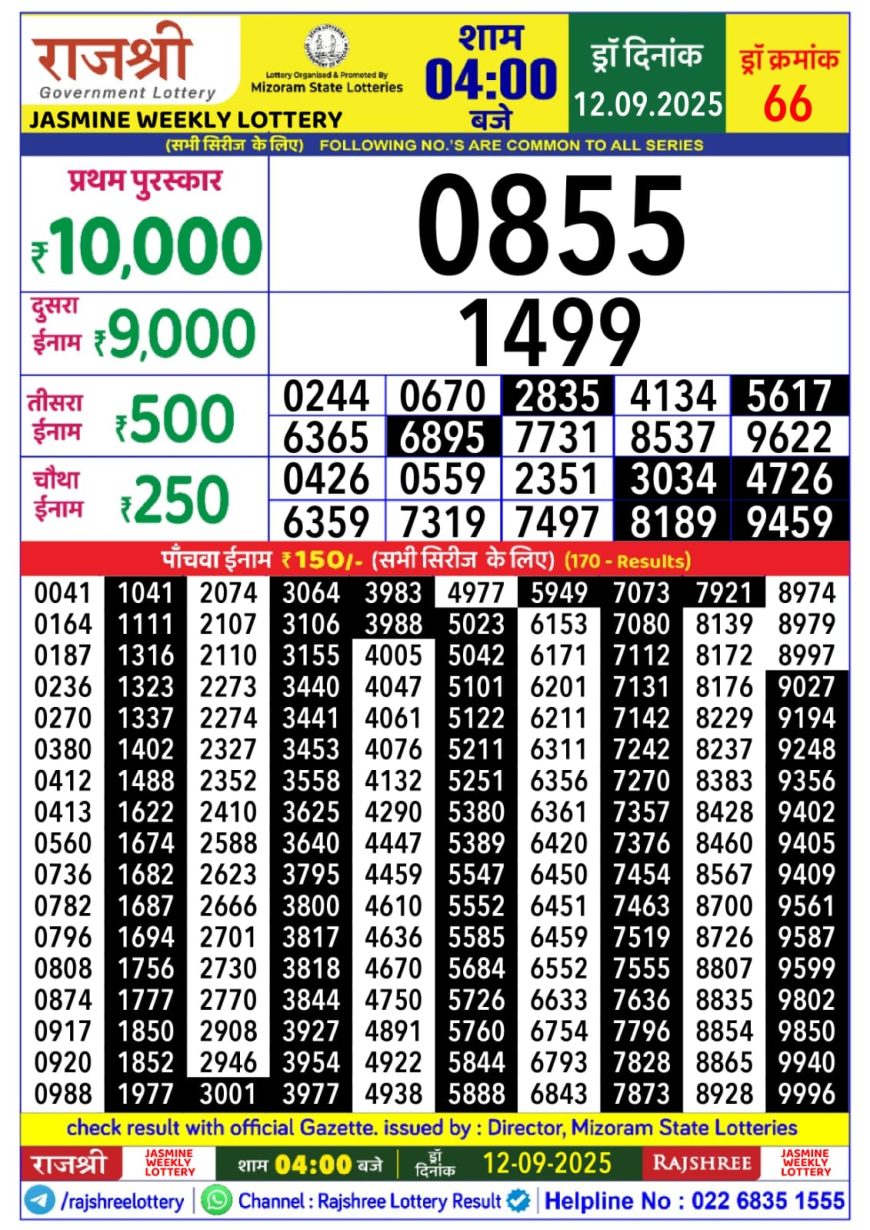 Rajshree Daily Lottery 4PM Result 12.09.2025 September 12, 2025 Leave a comment 12 September 2025 4pm – Mizoram state Rajshree Lotteries 4pm Result has been declared for 12/09/2025 . First prize rupees 10,000 Winning Ticket 0885 was went unsold today. Rest of the result is published here for your reference., Related Results Maharashtra Gajlaxmi Weekly Lottery 4.45PM Result 11.09.2025 Rajshree Daily Lottery 8 Pm Result 30.05.2025 Maharashtra Sahyadri Monthly Lottery Result 13.05.2025