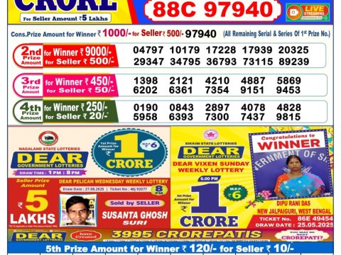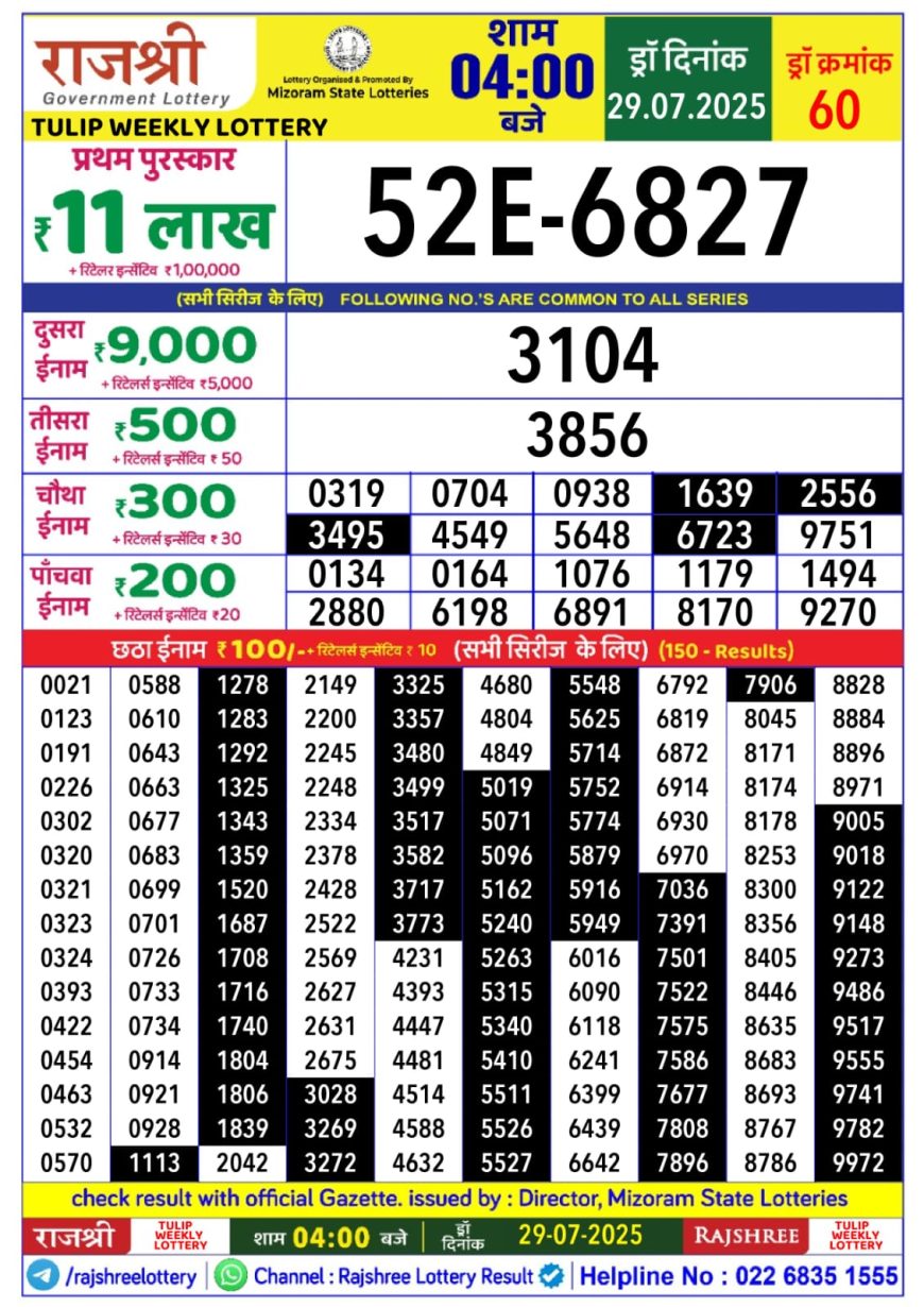 Rajshree Daily Lottery 4PM Result 29.07.2025 July 29, 2025 Leave a comment Related Results Rajshree 10 Daily Lottery 5.40PM Result 28.07.2025 Sikkim State Dear Lottery 6PM Result 07.09.2025 Maharashtra Mohini Weekly Lottery 4.30 Pm Result 22.06.2025