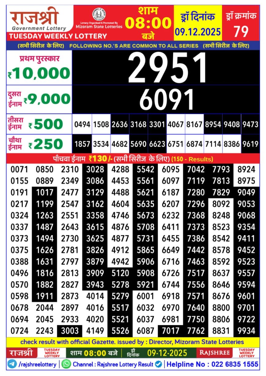 Rajshree Daily Lottery 8PM Result 09.12.2025 December 9, 2025 Leave a comment Related Results Dear Daily Weekly Lottery 6 Pm Result 18.06.2025 Golden Star Lottery 9PM Result 17.08.2025 Maharashtra Weekly Lottery 4.15 PM Result 10.07.2025