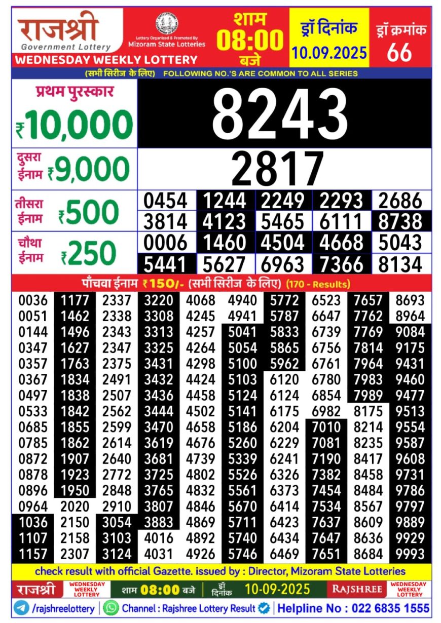 Rajshree Daily Lottery 8PM Result 10.09.2025 September 10, 2025 Leave a comment 10 September 2025 8pm – Mizoram state Rajshree Lotteries 8pm Result has been declared for 10/09/2025 . First prize rupees 10,000 Winning Ticket 8243 .Rest of the result is published here for your reference., Related Results Rajshree 50 monthly lottery result 6 30pm 25.09.2025 Punjab State Dear 10 Daily 6 PM Result 05.05.2025 Maharashtra Ganeshlaxmi Weekly Lottery 5PM Result 25.10.2025