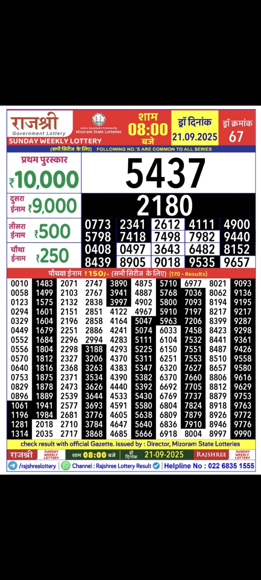 Rajshree Daily Lottery 8PM Result 21.09.2025 September 21, 2025 Leave a comment 21 September 2025 8pm – Mizoram state Rajshree Lotteries 8pm Result has been declared for 21/09/2025 . First prize rupees 10,000 Winning Ticket 5437 was unsold today.Rest of the result is published here for your reference., Related Results Maharashtra Sahyadri Weekly Lottery 4.30PM Result 08.10.2025 Labh Laxmi Daily Lottery 4PM Result 23.07.2025 Rajshree Daily Lottery 8 Pm Result 28.05.2025