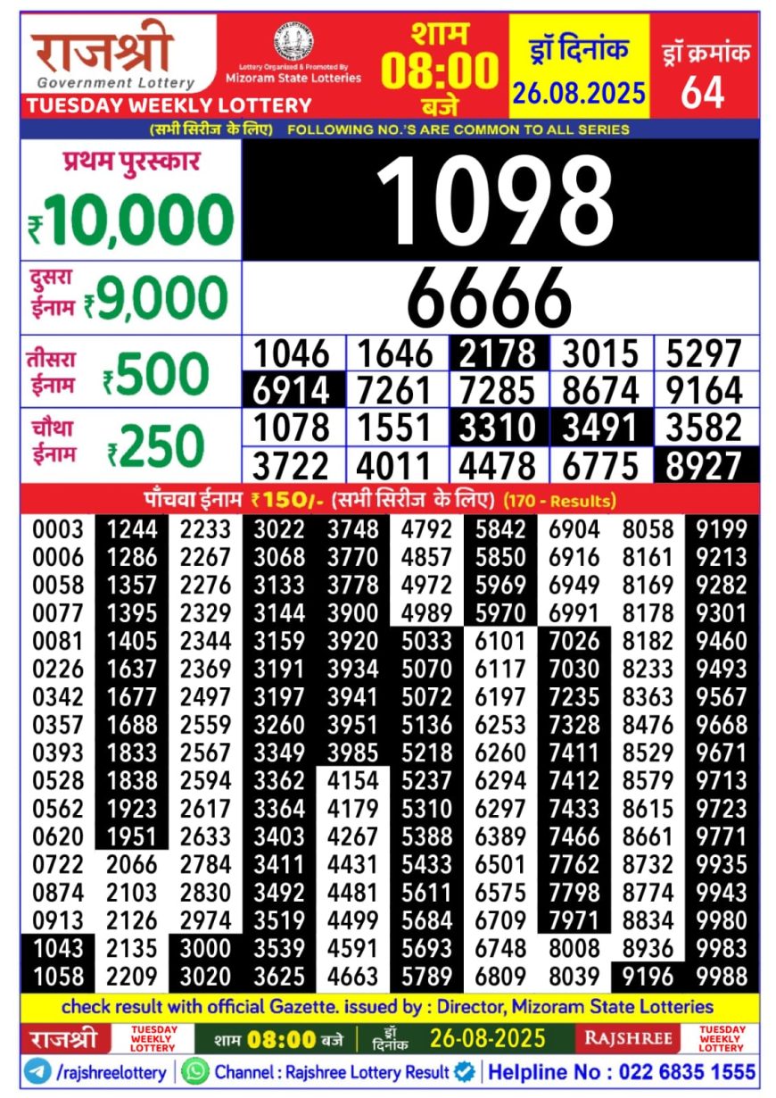 Rajshree Daily Lottery 8PM Result 26.08.2025 August 26, 2025 Leave a comment 26 August 2025 8pm – Mizoram state Lotteries Rajshree 8pm Result has been declared for 26/08/2025 . First prize rs 10,000 Winning Ticket is 1098. Second prize rs 9,000 was went unsold.Rest of the result is published here for your reference. Related Results Rajshree Daily Lottery 4 PM Result 05.05.2025 Golden Star Lottery 9PM Result 20.09.2025 Maharashtra Sahyadri Weekly Lottery 4.30PM Result 29.07.2025