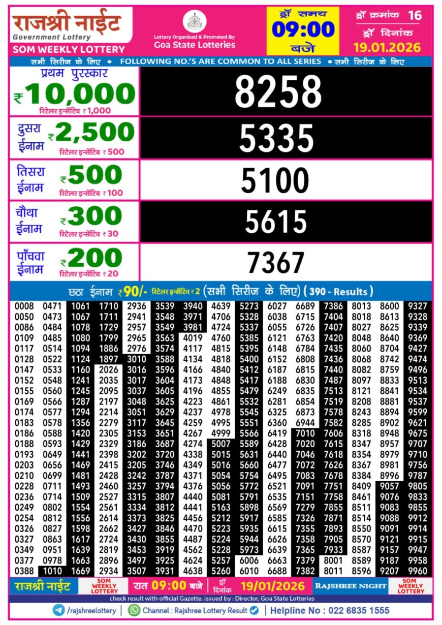 Rajshree Night Lottery 9pm Result 19.01.2026