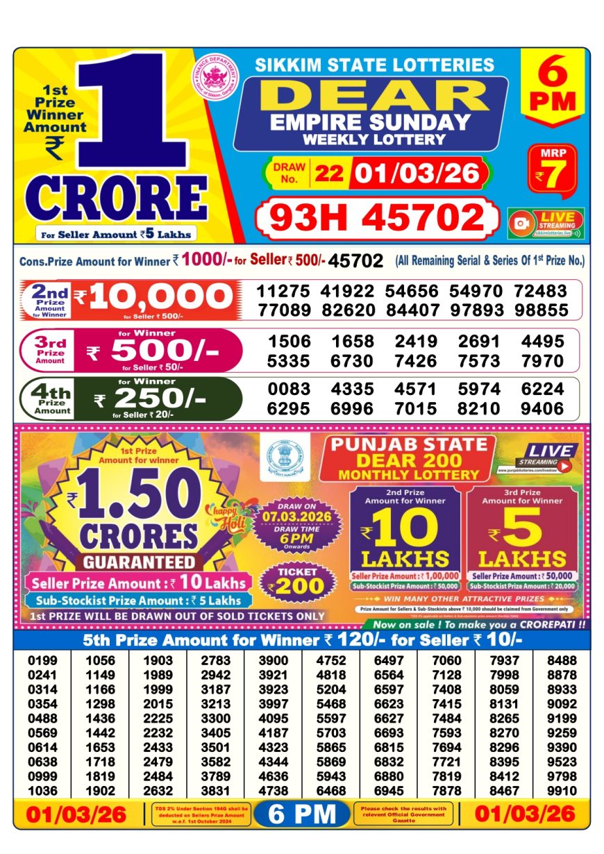 Sikkim State Dear Lottery 6PM Result 01.03.2026