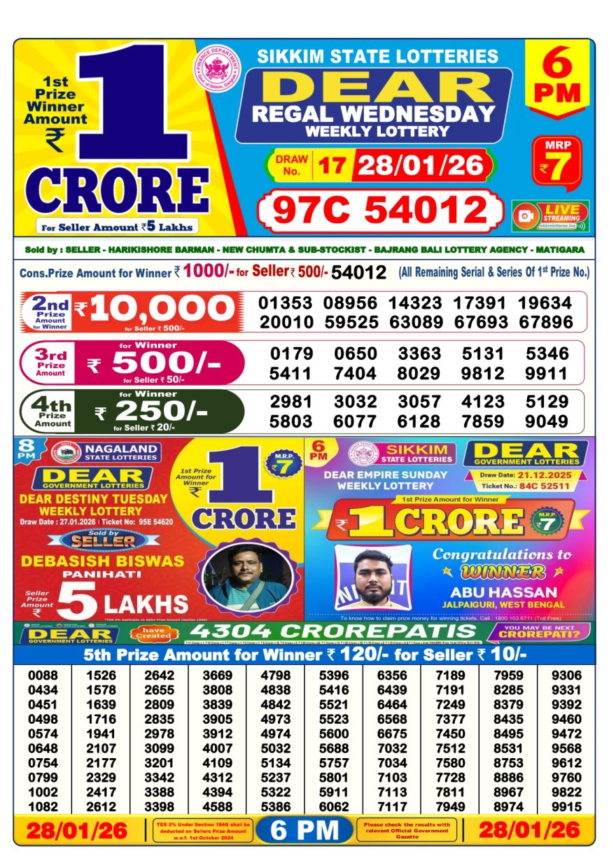 Sikkim State Dear Lottery 6PM Result 28.01.2026
